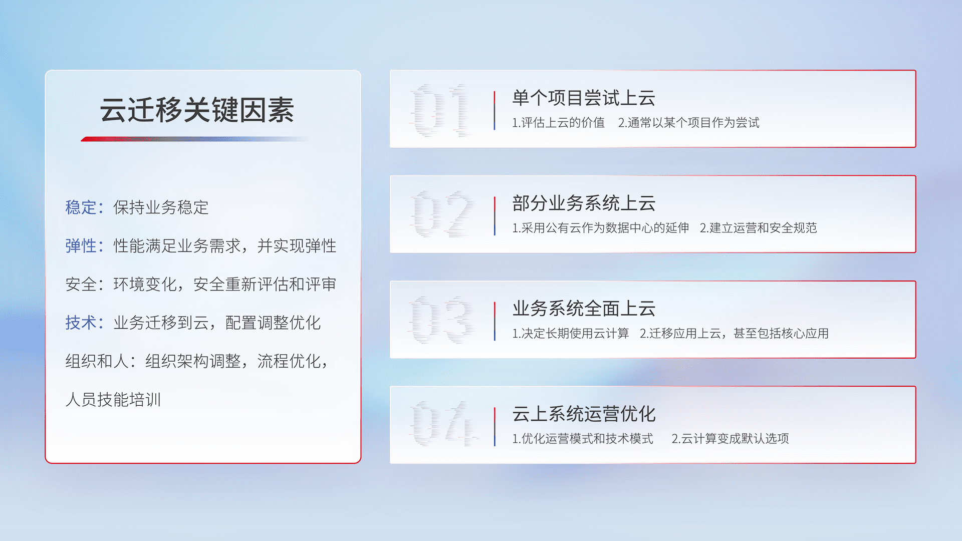 结合实际业务,,,从规划设计、、、云平台选型、、、云原生改造、、数据迁移、、、集成交付,,迁移全过程为客户识别最佳上云路径,,,,做好风险识别管理,,,设计网络架构、、身份权限、、、、安全审计合规、、、、操作审计、、、日志审计、、、、监控告警策略、、多站点容灾设计等,,,,对云上基础设施进行整体规划,,,,提升IT治理水平,,以满足弹性、、高可用、、、高性能的需求。。。。