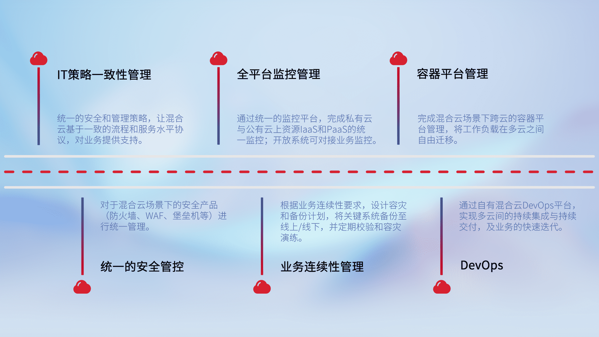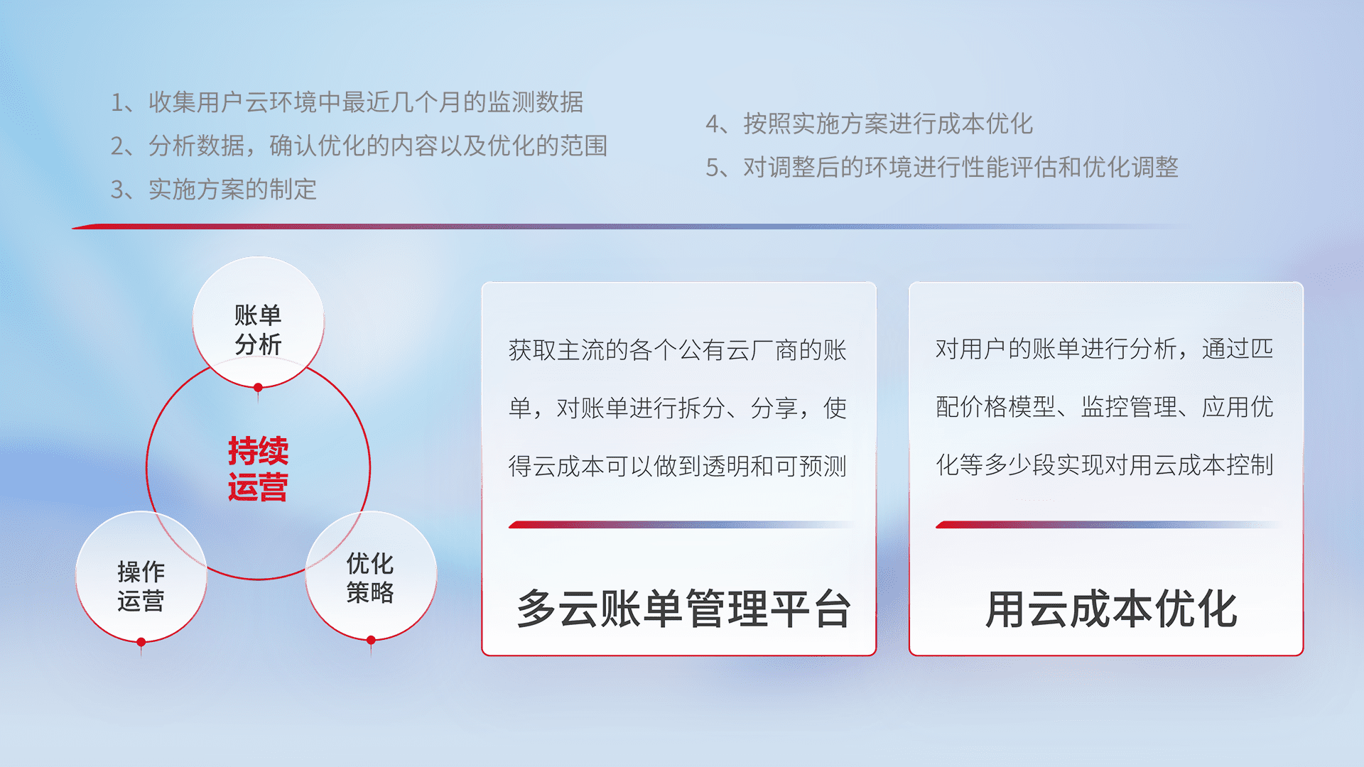 通过多云纳管,,,以统一的资源数据模型把客户的云资源进行抽象和封装,,,进而实现对多云资源的统一操作,,保障云资源管理的可靠性、、、、稳定性与可用性。。。。量身定制化运维内容,,配置、、、、开发运维、、、补丁管理、、、备份、、、监控、、、认证和访问管理、、审计和日常巡检等,,,,保障在用云过程中的可靠度,,,稳定度以及高可用率。。。