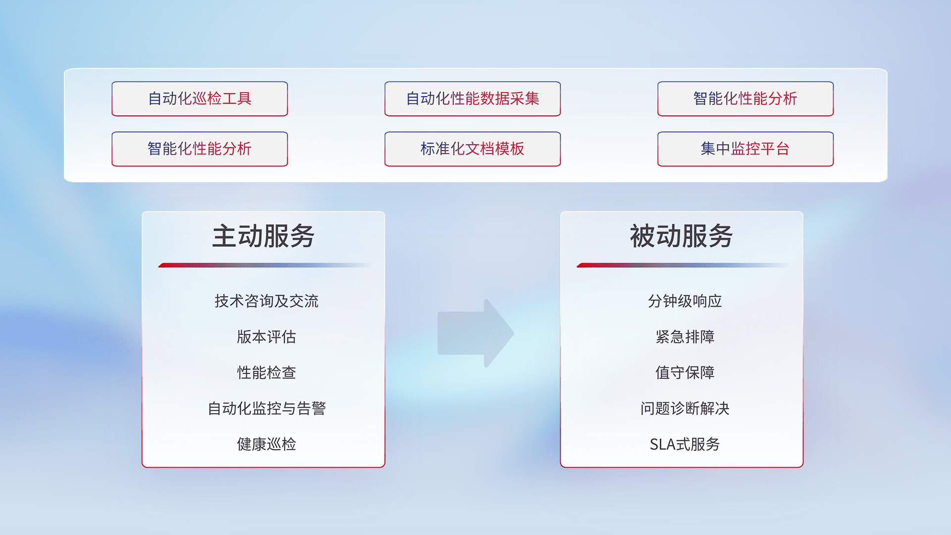 智能化工具和标准化文档,,,,保障服务质量,,提供主动服务(包含技术咨询、、、版本评估、、、、性能检查、、、、自动化监控与告警、、、、健康巡检)和被动服务包含(分钟级响应、、紧急排障、、、值守保障、、、问题诊断解决、、、SLA服务)。。。。